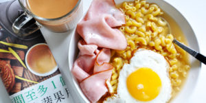 1 cup of Macaroni, 3 cups of Chicken Broth, 1 tsp of Light Soy Sauce, 2 slices of Ham, 1 Fried Egg