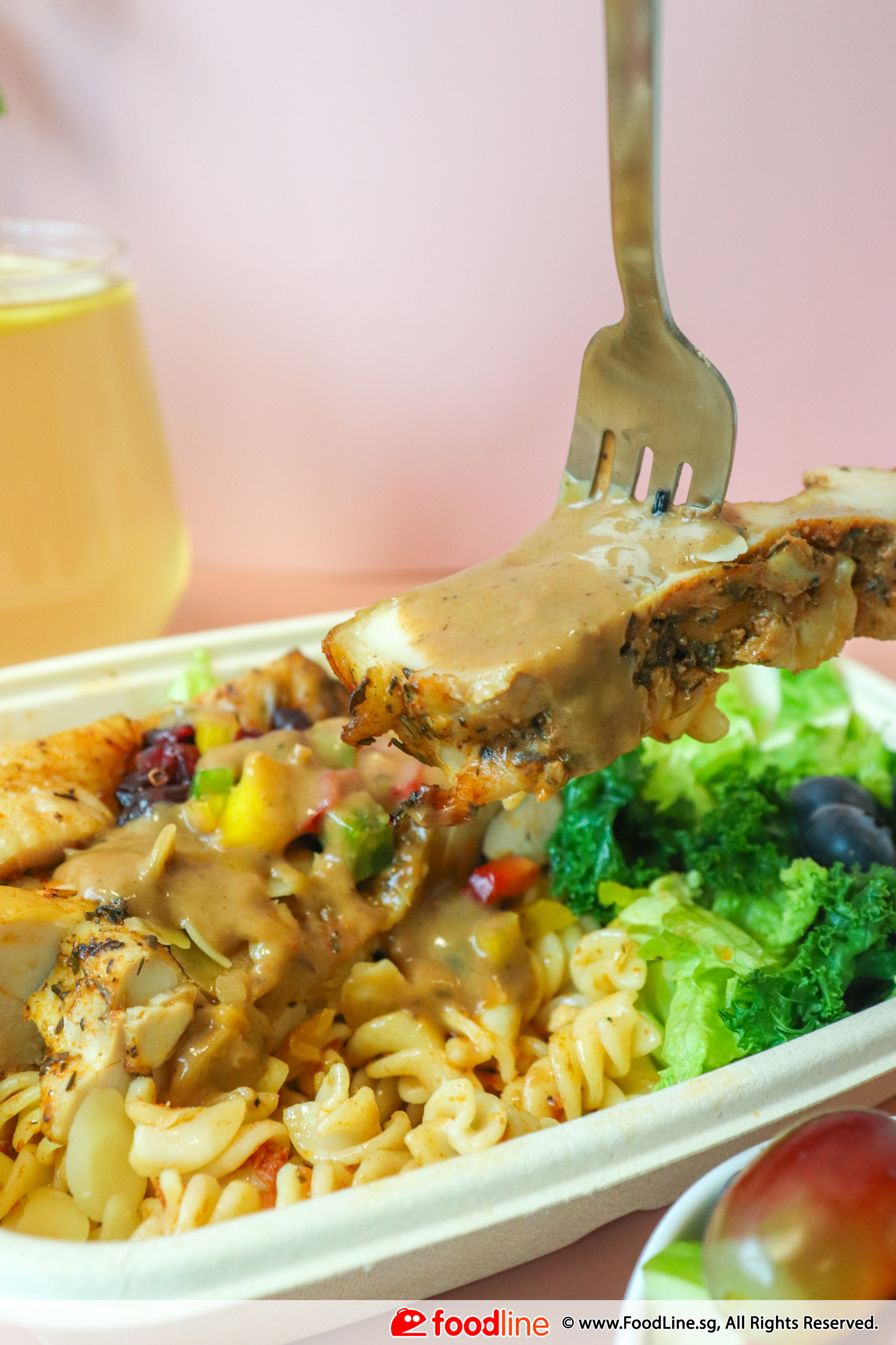 A vibrant medley of flavours and textures! Juicy Cajun chicken seasoned with paprika sits alongside sundried tomato pesto pasta that brings a tangy depth. Sweet blueberries, crunchy kale, and a mix of mesclun greens make every bite refreshing. The cranberries and diced capsicums add pops of colour and sweetness, while almond flakes offer a delightful crunch. The black pepper mushroom dressing ties it all together with a smoky, zesty punch.