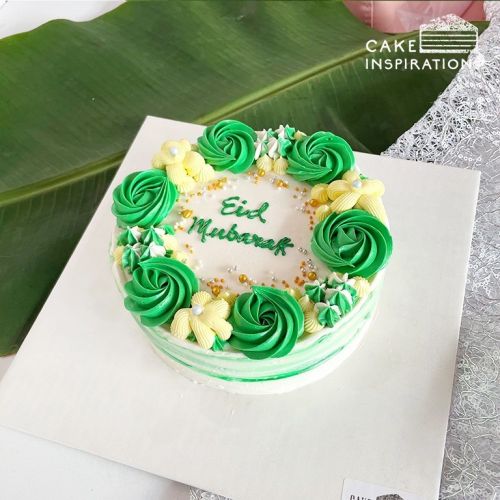 This is a meticulously designed pandan sponge cake with salted caramel filling, topped with green and light yellow colored rosette cream design. It is 6 inch round and 6cm tall, affordably priced at $40.
