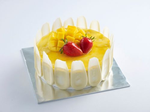 Their ultimate signature indulgence! Lusciously layered with mango mousse & mango bits in soft vanilla sponge, topped with fresh mango slices glazed with fresh mango & strawberries.