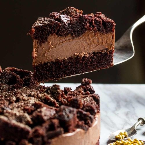 Dark chocolate cake that is luscious and moist, layered with yummilicious hazelnut praline, and finished with a smooth creamy chocolate glaze and luxurious gold sprinkles.