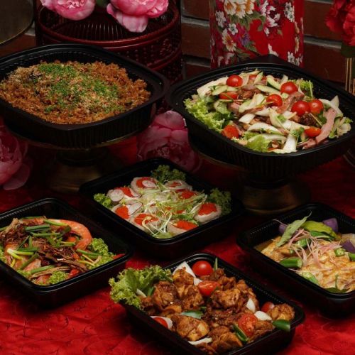 Consider Spark and Flame Catering's 8-course brunch ($188 for 10 pax) for a winning treat. The meal includes Stir Fry Kung Pau Chicken with Teriyaki Sesame, Hong Kong Kailan with Bailing Mushroom, Fish Fillet with Mongolia Sauce, and more, and is available from April 25 through May 15, 2022. Desserts feature Chilled Almond Beancurd with Longan and Rainbow Swiss Roll.