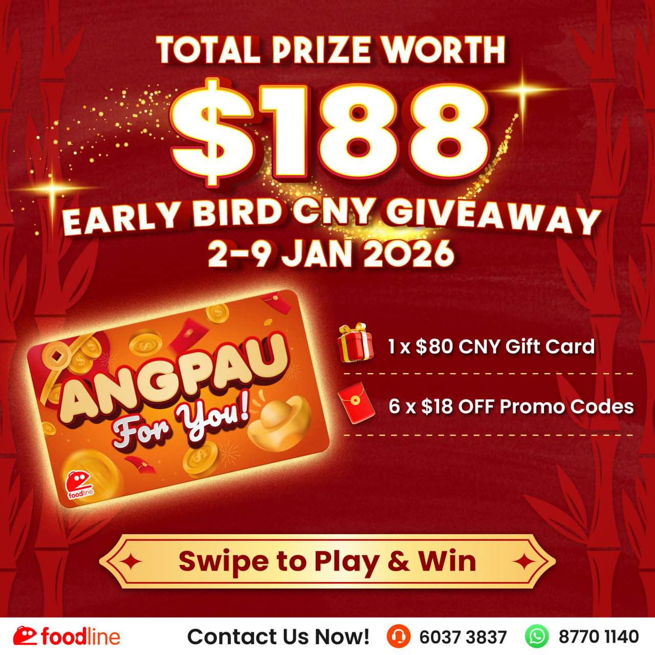 Join our Early Bird CNY Giveaway for a chance to win an $80 FoodLine CNY Gift Card to enjoy goodies from 350+ outlets (Duke Bakery, TCC & more š), plus $18 OFF promo codes for your CNY feast on FoodLine. We’ll be selecting 4 winners from Facebook/Instagram and 3 winners from Telegram—and you’ll boost your chances by joining our Telegram. Don’t miss out on this sweet opportunity!