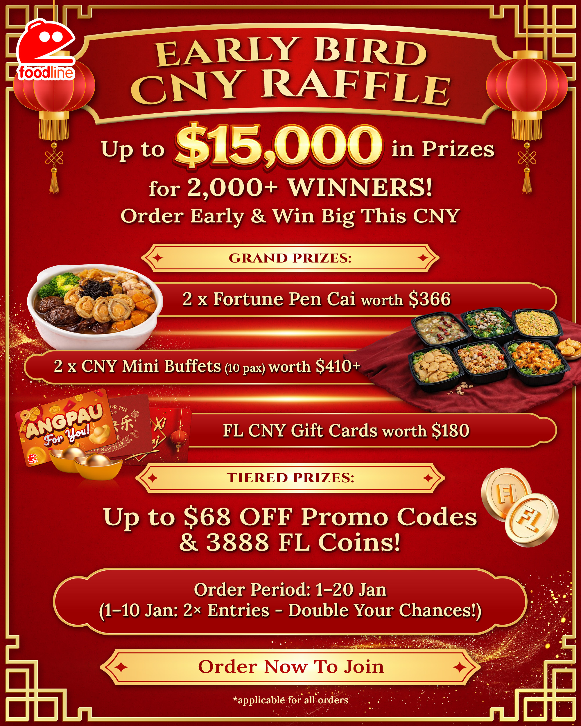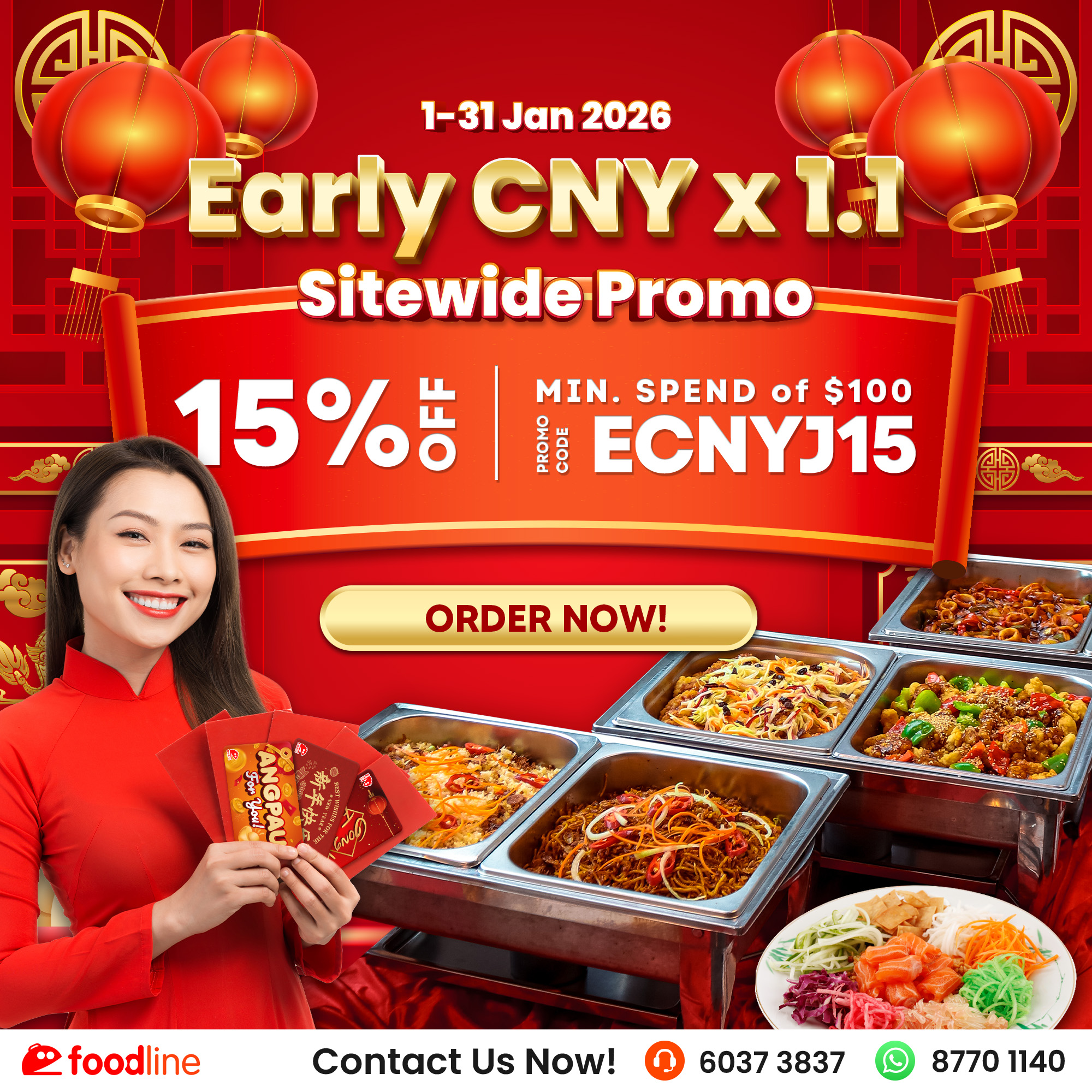 Enjoy an incredible 15% OFF with a min. spend of just $100 (capped at $15) when you place your early Chinese New Year catering orders on FoodLine!