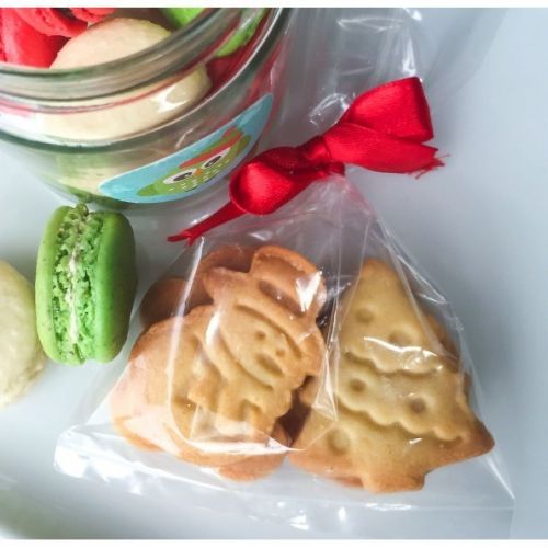 Christmas cookies, packed in 2s or 4s with a red or green ribbon tie.