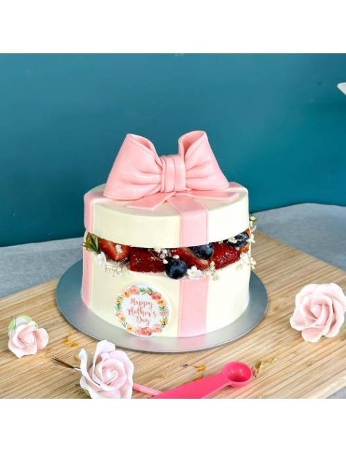Treat your beloved mother to a delightful surprise with LÉLE Bakery's Mother's Day Gift Box Cake! Made with love and care, this beautiful cake is frosted in luscious white buttercream and adorned with a charming assortment of berries, flowers, pink ribbons, and a special Mother's Day tag. It comes complete with a gold candle and a plastic knife for added convenience. With its exquisite design and delectable taste, this cake is sure to make your mother's day extra special.