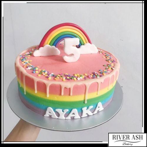 This cake is frosted with smooth buttercream in 5 pastel colours in a swirls design. It comes with white chocolate drip and lots of rainbow sprinkles. Topping it off is a fondant rainbow topper! Fondant name and age are included! The cake comes in many different sizes, so do check out the link below to see which cake size you prefer!