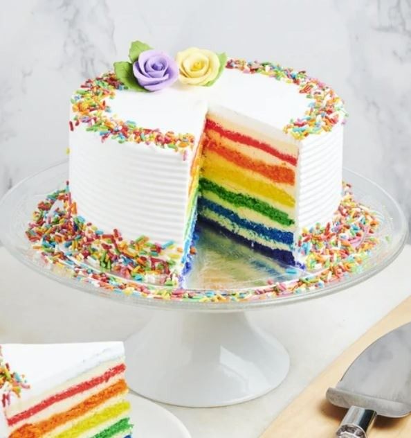 Eat the cake layer by layer or taste the entire rainbow with a delicious frosting between the cake layers. Soft, spongy vanilla cakes that’s tinted to create this lovely rainbow goodness. Making it the queen of celebration cakes!