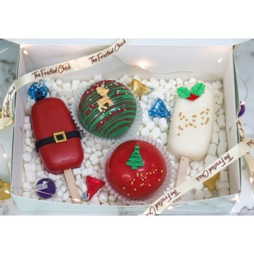 Discover enchanting Christmas joy with 'The Frosted Chick'—our Christmas Gift Box is a festive marvel! Inside, you'll find 2 x Cakesicles and 2 x Chocolate Bombs, featuring the Vanilla White Christmas Cakesicle, Chocolate Santa Cakesicle, Red Christmas Tree Hot Chocolate Bomb, and Green Reindeer Hot Chocolate Bomb. Best of all, each piece is just $8! And that's not all; every cake order includes a complimentary greeting card, making it the perfect way to send your warm wishes to your loved ones during this festive season.