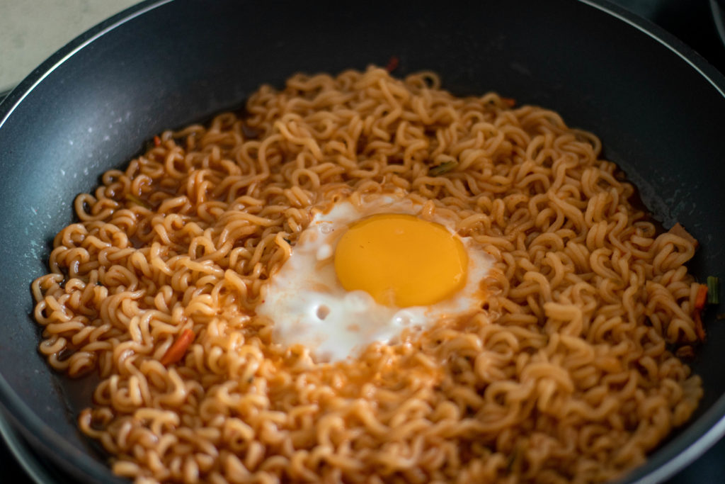 This is my personal favourite. Instead of using 500ml of water, cut it down to just 350ml, and use half the packet of seasoning provided. Cook the noodles until the water has boiled down and the noodles would have soaked up all the amazing flavour!