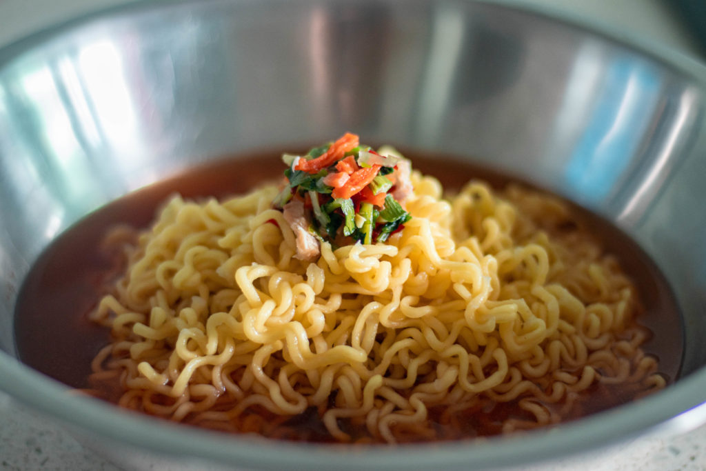 On days when you are craving ramen, but the weather is way too hot for you to sweat through your meal, this cold ramen is the solution. Cook your noodles and broth separately. For the broth, I used 400ml of water and entire pack of seasoning. Let the broth cool and add ice or if you are patient enough you can pop it into the fridge for a bit. Then add the noodles to the broth and enjoy!
