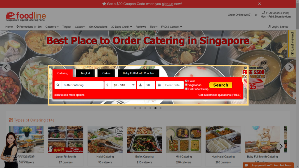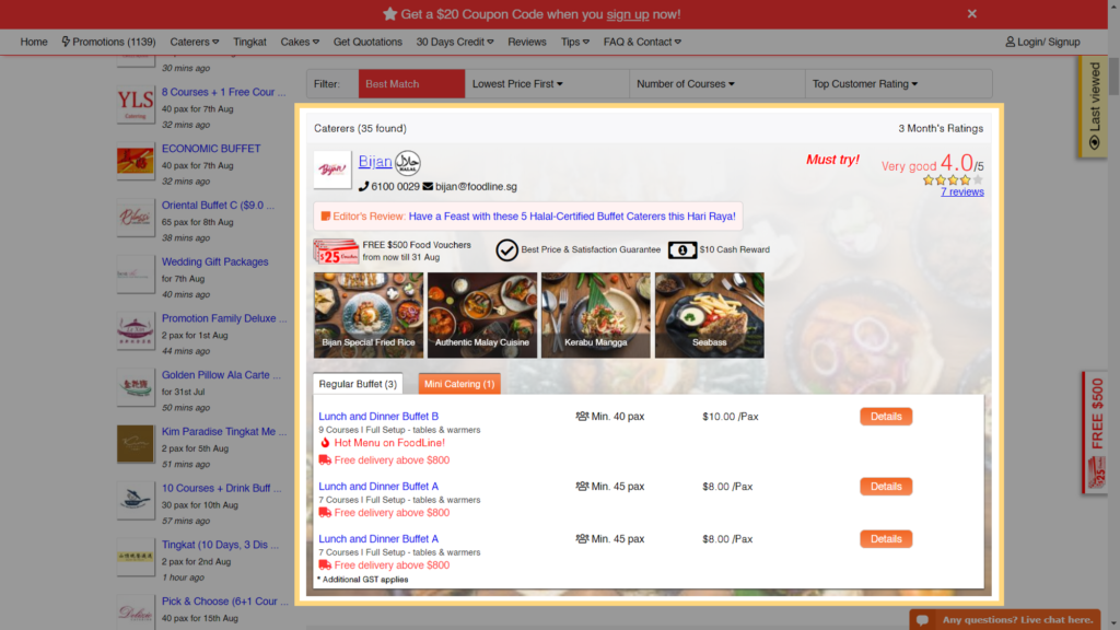 Alright, so you’ve reached FoodLine’s website and don’t know what to do. But you know that you’re looking for (eg. a Halal caterer for an event with 50 guests, with a budget of around $8-$10 per pax). You can filter this in to narrow down the caterers you can order from – we do the work for you, so you can find the perfect caterer for your event faster! 😊