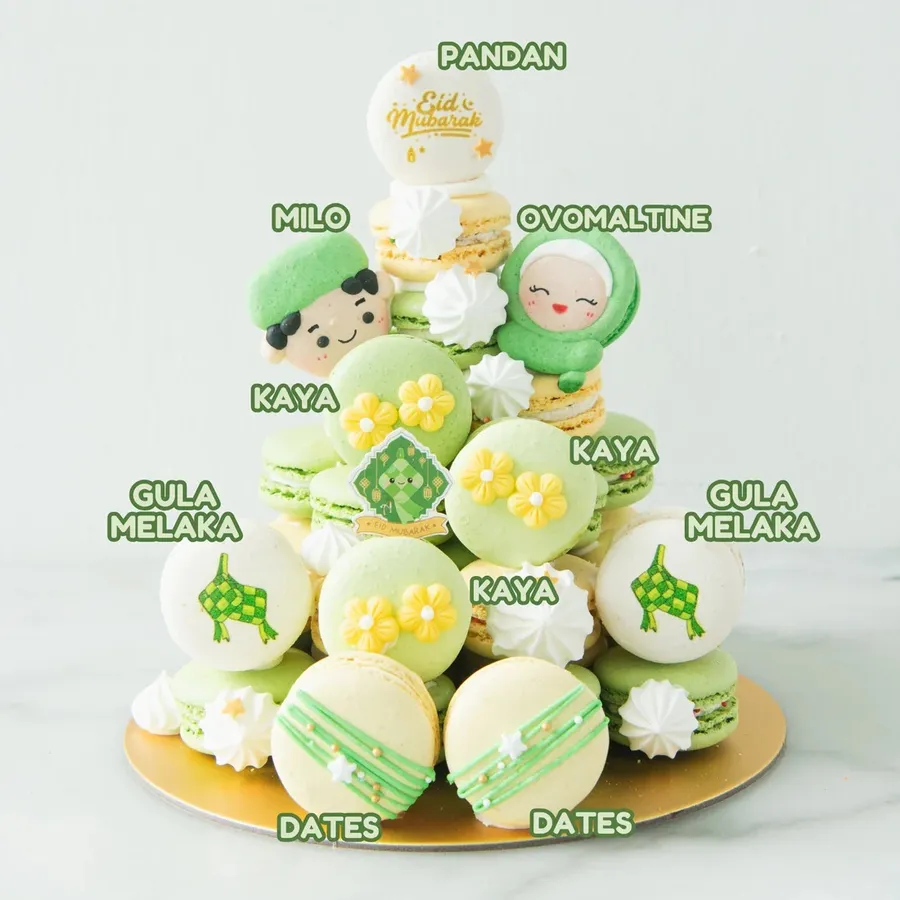 Tower of : 30 pcs macarons (rose & earl grey), 5pcs Girl Unicorn Macarons , 5pcs Boy Unicorn macaron (Vanilla flavour), 2pcs heart shape