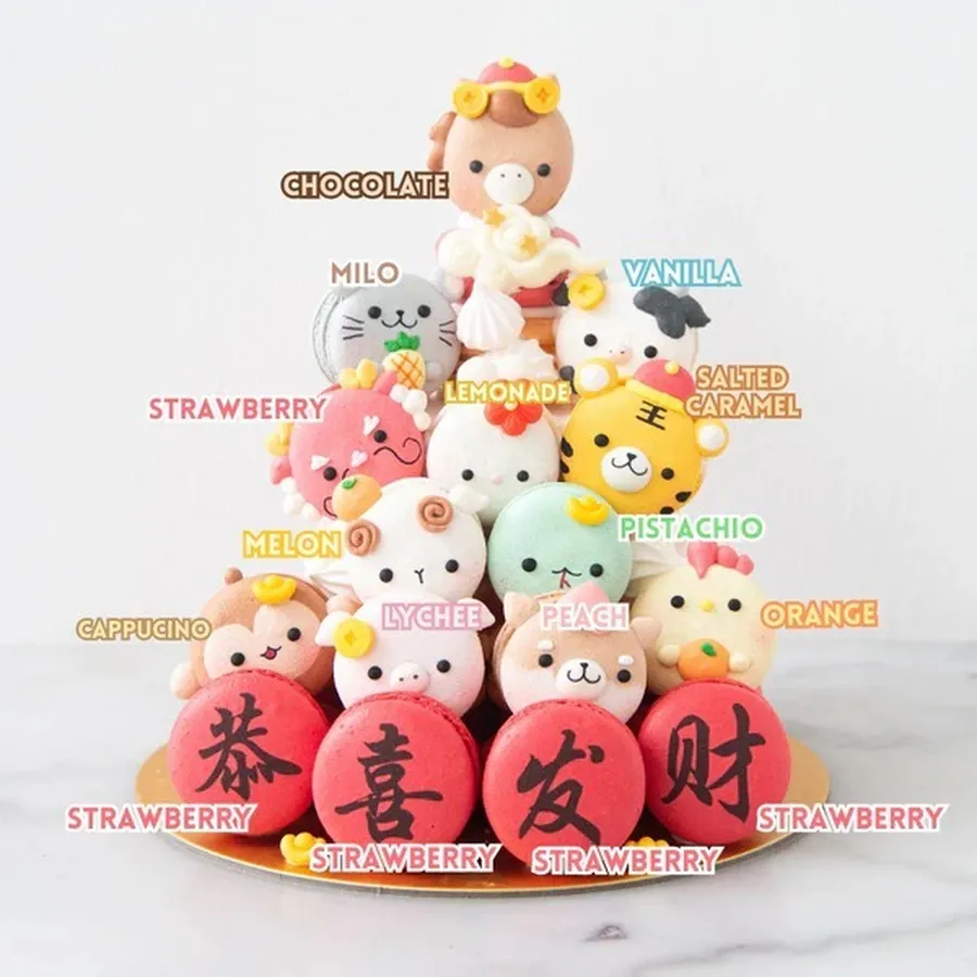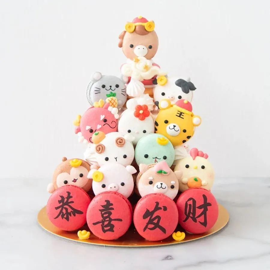 Celebrate the vibrant spirit of the Chinese New Year with the exquisite Zodiac Macaron Tower, a stunning confectionery masterpiece that embodies the essence of this festive season. This eye-catching tower is meticulously crafted, showcasing a delightful array of colorful macarons, each one a symbol of prosperity and good fortune. Adorned with intricate designs inspired by the twelve zodiac animals, this tower not only serves as a delectable treat but also as a captivating centerpiece for your celebrations. Perfect for gifting or sharing with loved ones, the Zodiac Macaron Tower invites you to indulge in a sweet experience that harmonizes tradition and elegance, making your New Year festivities truly unforgettable.