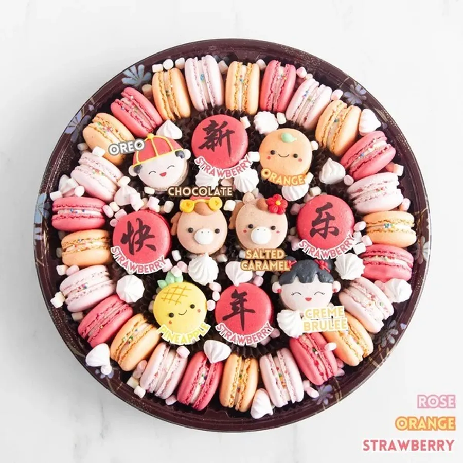 Indulge in the exquisite charm of the Lucky New Year Jumbo Treasure Macaron Set — a lavish collection of 35 meticulously crafted macarons created to celebrate the Chinese New Year and honor the Year of the Horse. Each macaron is beautifully adorned with whimsical designs featuring playful children and adorable horses, symbolizing joy, prosperity, and good fortune.