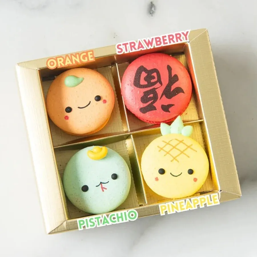 Celebrate resilience and strength with our 4in1 Diligent Ox Macaron Set. This 4-piece macaron set includes one with an adorable ox illustration, representing diligence and prosperity. Share the joy of the new year with this limited-edition set, perfect for gifting or enjoying with family and friends.