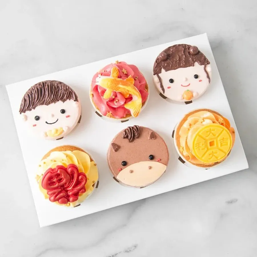 Celebrate the Chinese New Year with our adorable 6pc Lucky New Year Cupcakes! This set includes six delicious cupcakes, each decorated with festive and charming icing designs. Three cupcakes feature sweet designs: a girl, a charming boy, and a cute Horse—each symbolizing joy, prosperity, and good fortune for the new year. The other three cupcakes are beautifully decorated with seasonal designs, capturing the spirit of the celebration. Perfect for sharing with loved ones or gifting to those near and far, these cupcakes offer a delightful combination of flavor, creativity, and festive cheer for your celebrations.