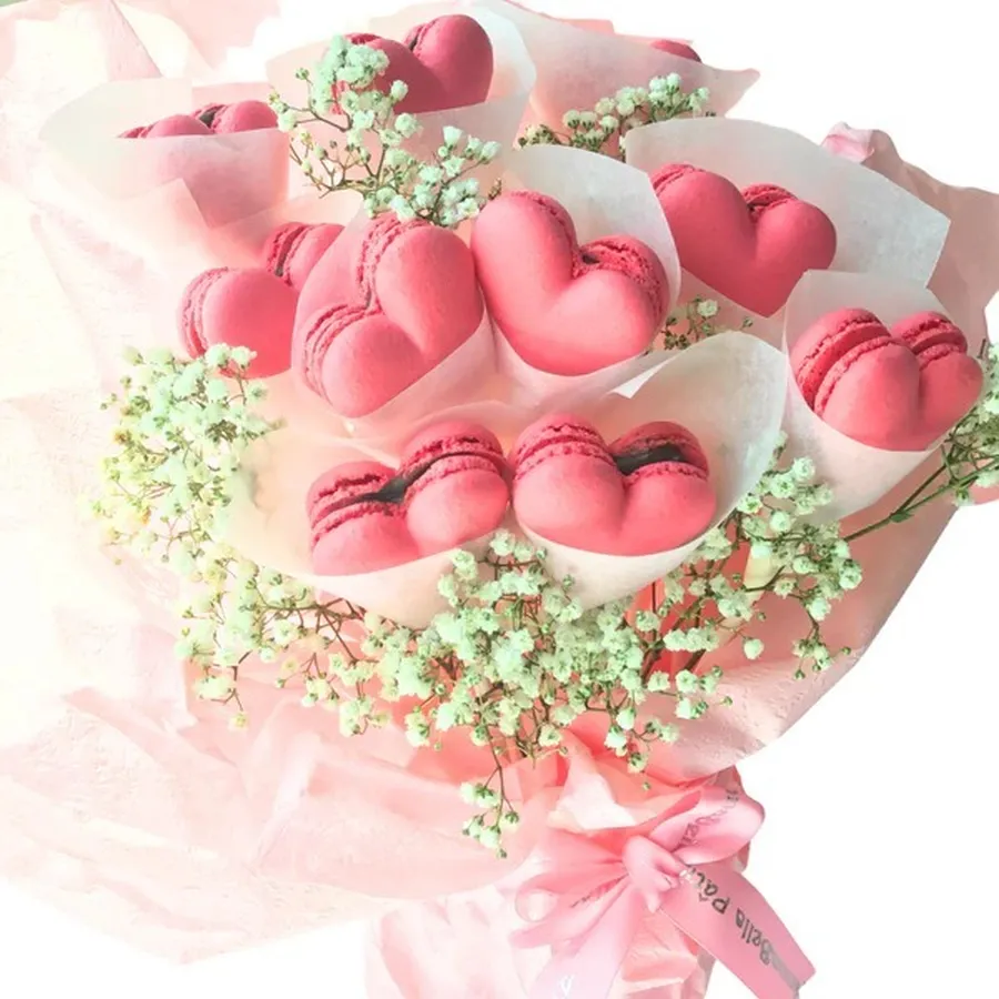 Macarons Bouquet Flowers (10pcs Heartshaped) with Fresh Flower and Ribbon + 1 Box 10pcs Premium 1