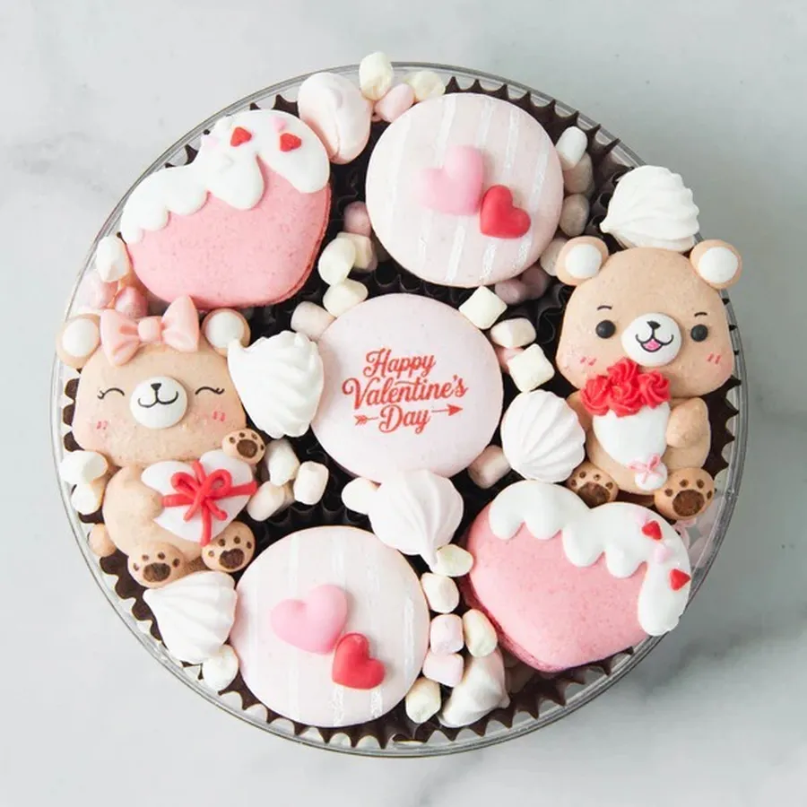 Discover the perfect way to express your love with our Sweetheart Bears 7pc Treasure Set. This charming set includes two adorable character couple bear macarons, two heart-shaped macarons, and three classic macarons, each filled with decadent flavors. The macarons are beautifully decorated with chocolate roses, fluffy marshmallows, and delicate meringue, adding an extra touch of sweetness and elegance. Whether you're gifting them to a loved one or sharing the joy with family, this treasure set is a delightful treat for any Valentine's Day celebration.