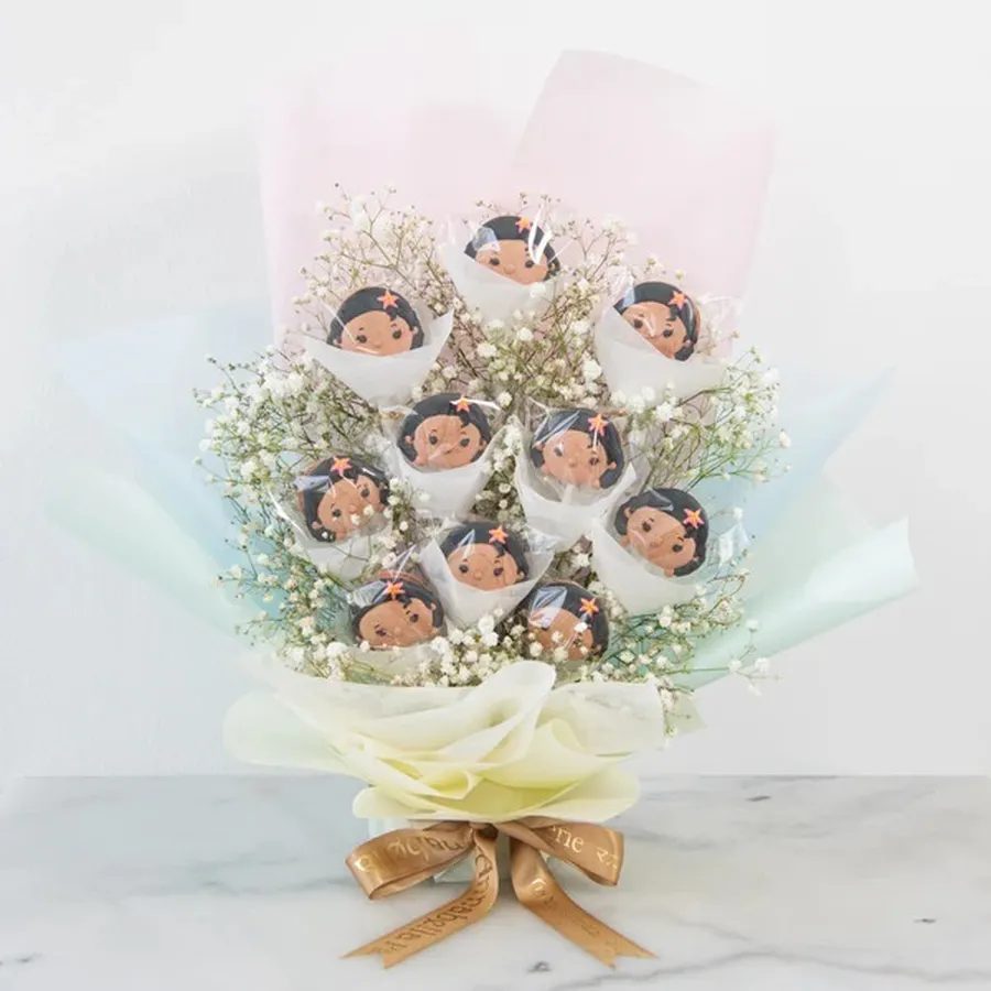 Bring a touch of Disney magic to any occasion with this enchanting Moana-themed flower bouquet. Featuring soft, delicate baby’s breath flowers, this stunning arrangement is paired with 10 beautifully crafted macarons, each designed with care to showcase Moana’s iconic character. Whether you're celebrating a special occasion or just spreading joy, this thoughtful and unique bouquet is the perfect gift for any Disney Princess fan.