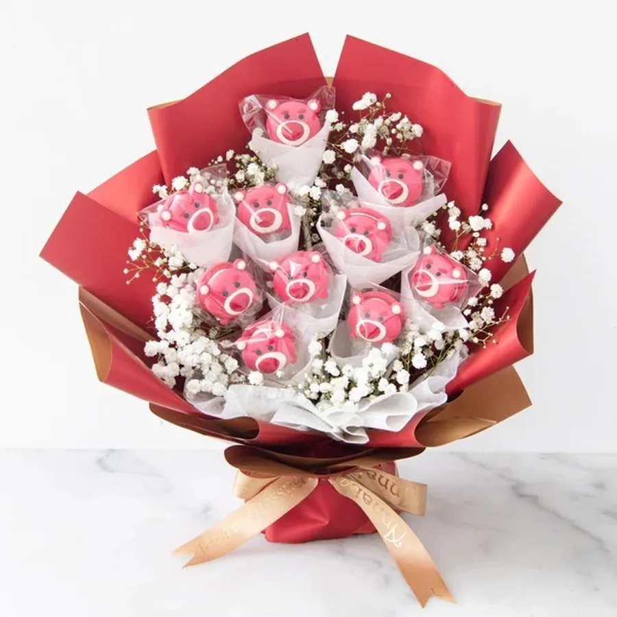 The Disney Tsum Tsum Lotso macaron bouquet showcases macarons shaped like the most-favorite Lotso from Toy Story. Each macaron is beautifully decorated, capturing Lotso's charming details and vibrant colors. This delightful bouquet combines sweet flavors with Disney magic, making it a perfect treat or gift for family.