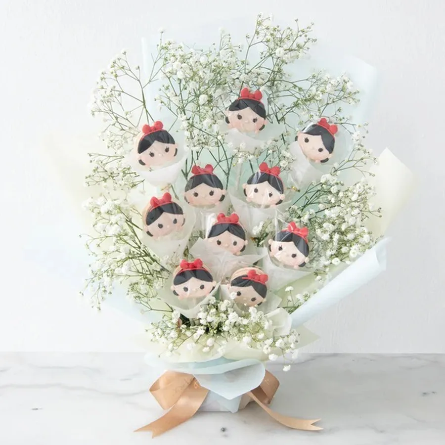 Delight in the enchanting Snow White Macaron Bouquet, a whimsical arrangement that combines the charm of Disney's beloved princess with the sweetness of delectable macarons. This stunning bouquet features delicate baby's breath flowers, creating a dreamy backdrop for the colorful macarons that add a touch of elegance and fun. Perfect for celebrations or as a unique gift, this bouquet is sure to bring joy and a sprinkle of magic to any occasion.