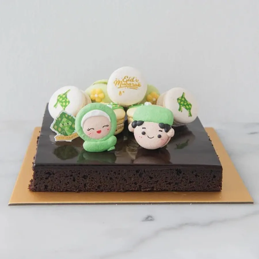 With its fudgy texture, delightful macaron crunch, and elegant decoration, this brownie cake is ideal for family gatherings, Raya open houses, and festive gifting. Share the sweetness and joy of Eid with every bite!