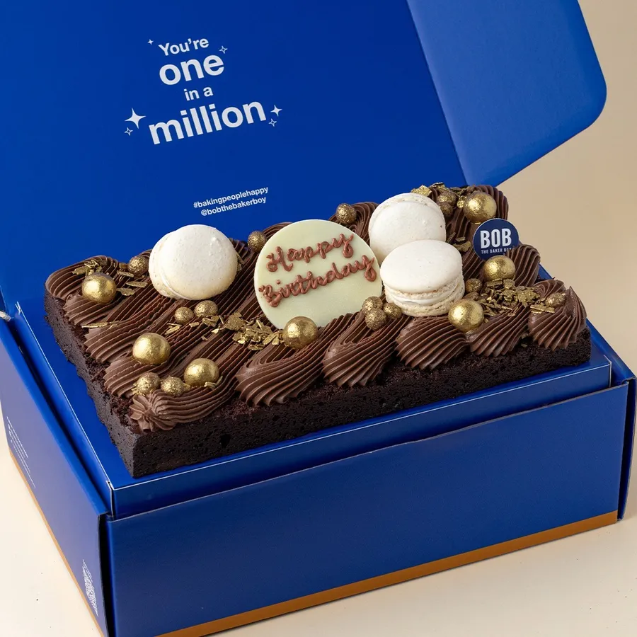 Go big on birthdays with our Happy Birthday Brownies! This full-sized brownie slab is baked with rich 55% dark chocolate, finished with luscious swirls of chocolate cream, and adorned with gold-dusted spheres, crisp white macarons, and a handcrafted “Happy Birthday” plaque. Elegant yet indulgent, it’s the perfect centerpiece for celebrations—ideal for sharing at parties or surprising someone special from afar.