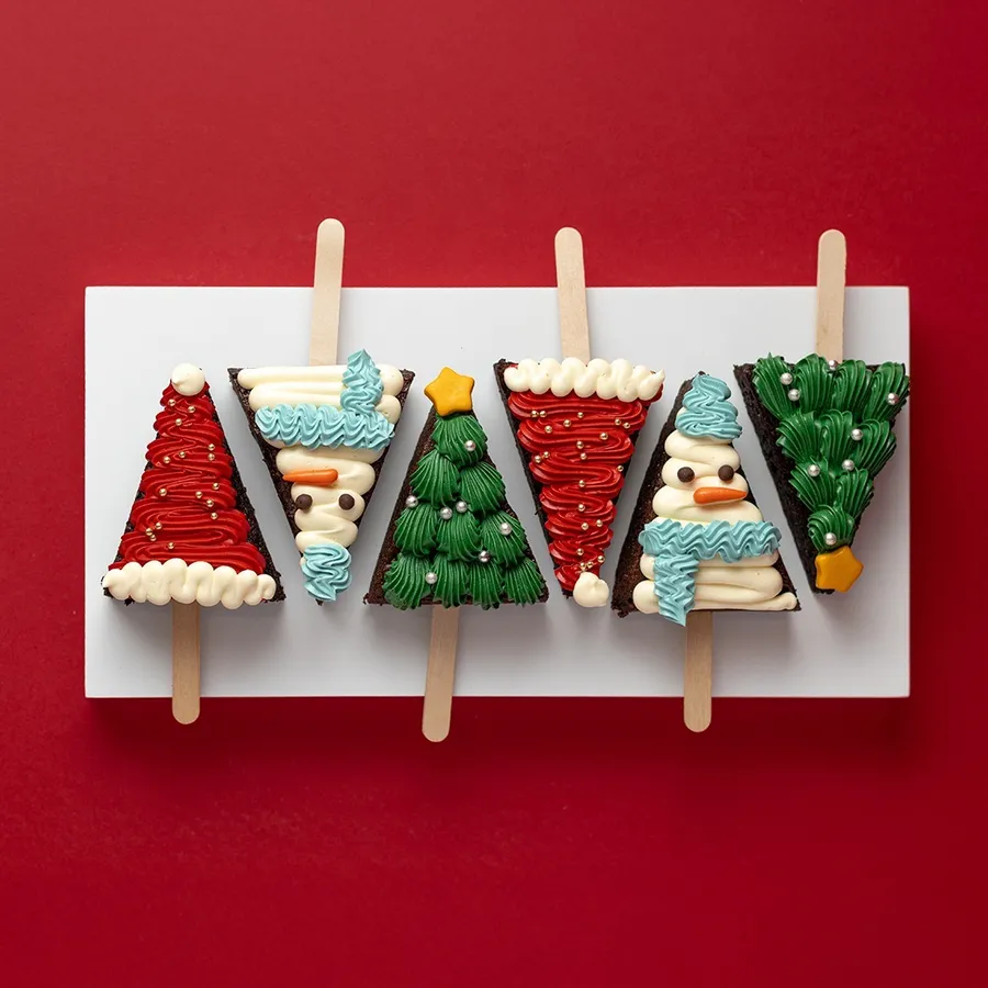 A playful addition to the festive menu, our Christmas Brownie Pops feature our signature fudgy brownies shaped as Santa hats, snowmen, and Christmas trees. Each piece is coated in creamy buttercream, combining rich chocolate flavour with whimsical presentation — perfect for Christmas parties or thoughtful gifting.