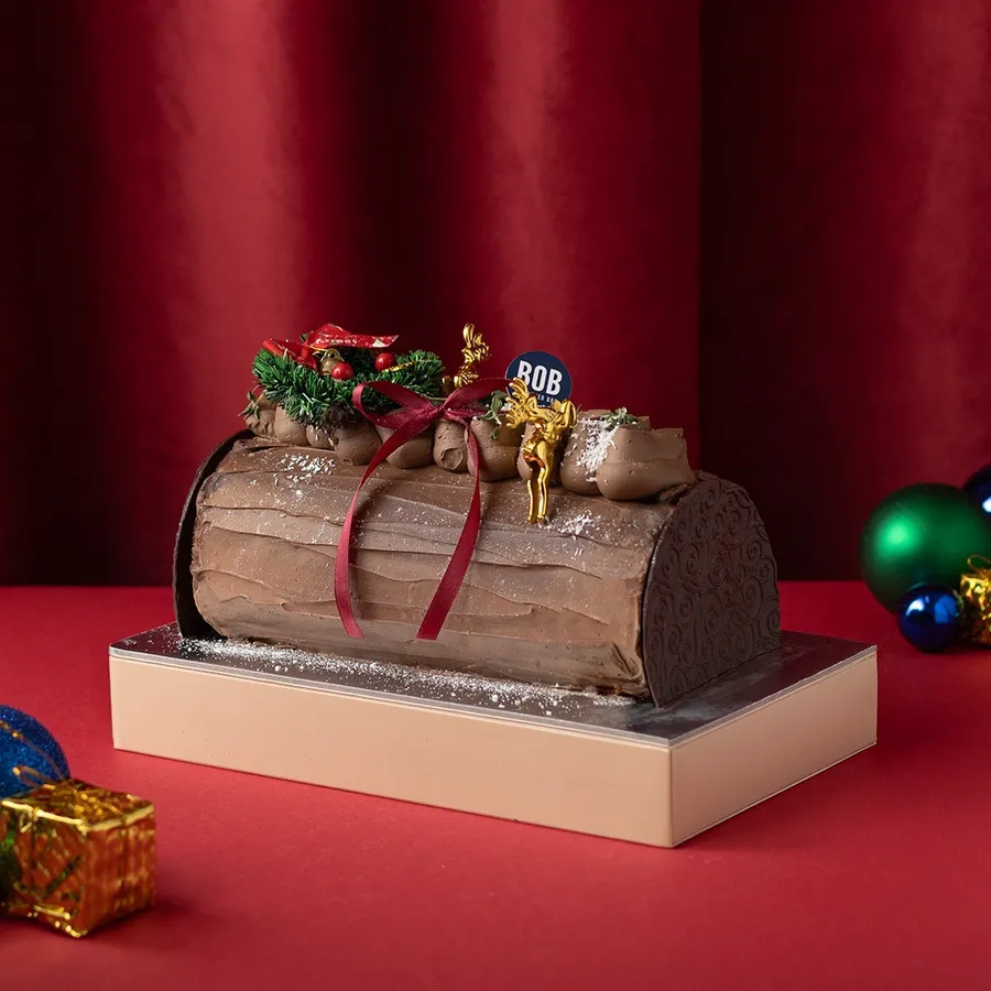 Festive Classic Flavor: A rich, moist chocolate sponge rolled with smooth chocolate custard and topped with a rustic 55% Belgian chocolate ganache