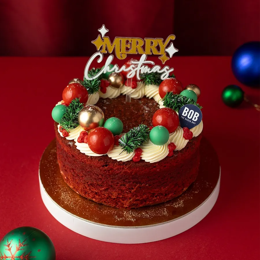 A festive twist on a timeless favourite. Our Christmas Wreath Blondie Cake combines the chewy texture of a blondie with buttery sweetness, crowned with cream swirls, ornaments, and a decorative “Merry Christmas” topper. Its classic design and rich flavour make it a beautiful centrepiece for any Christmas table.