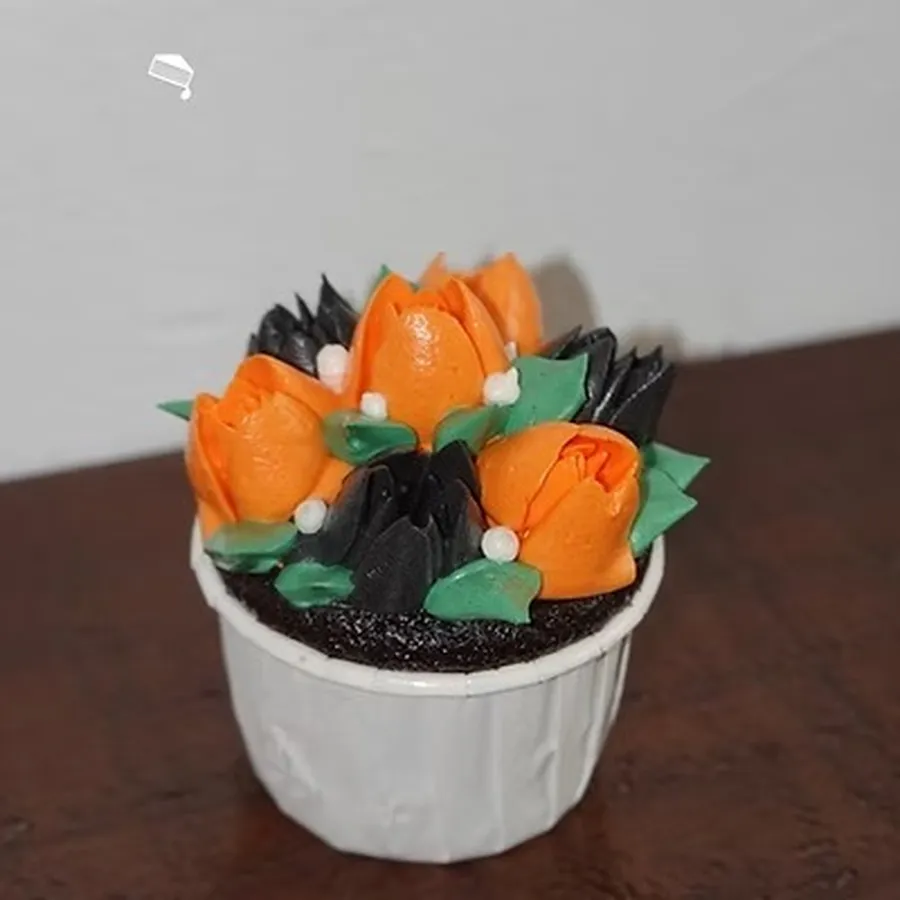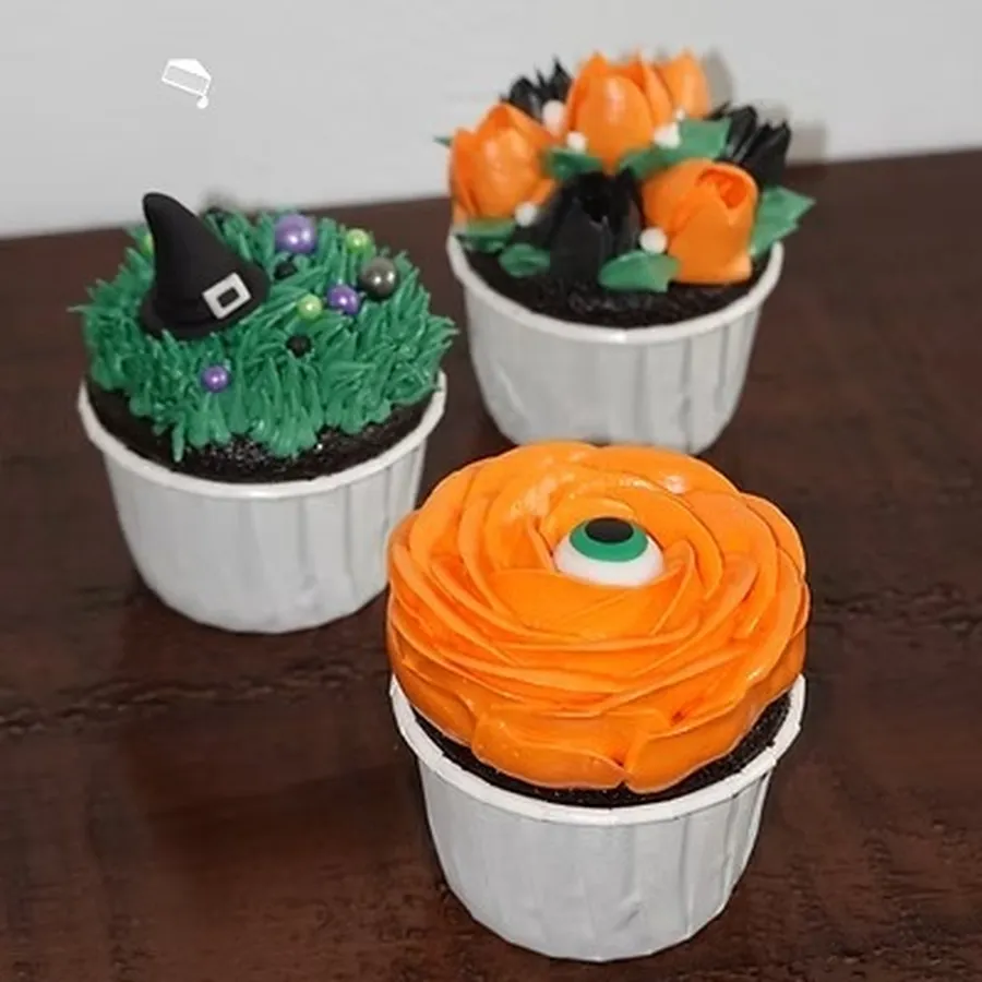 A selection of festive cupcakes with spooky and floral Halloween-themed decorations.
