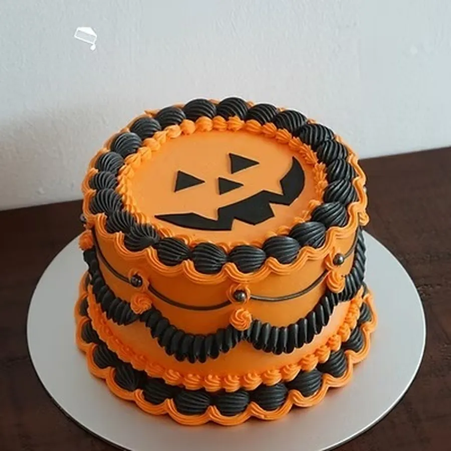 A nostalgic halloween treat featuring a hand-piped vintage buttercream design and a smiling jack-o- lantern face. Perfect for a charmingly spooky celebration.
