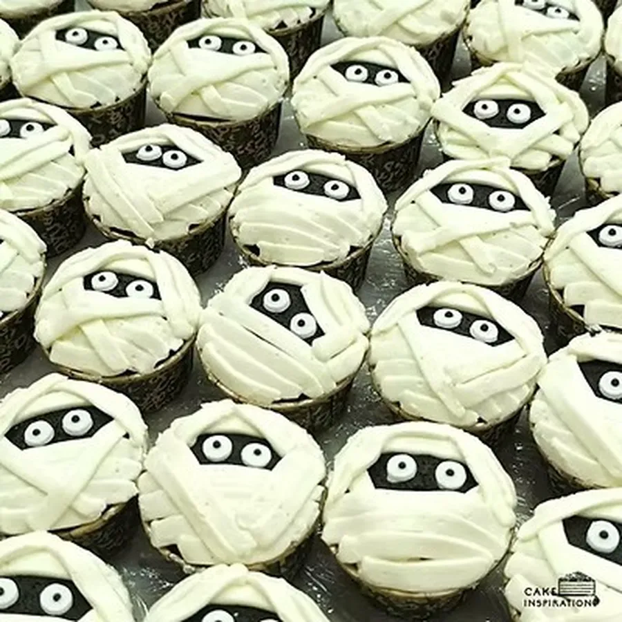 A fun and colorful collection of cupcakes featuring various Halloween-themed decorations.