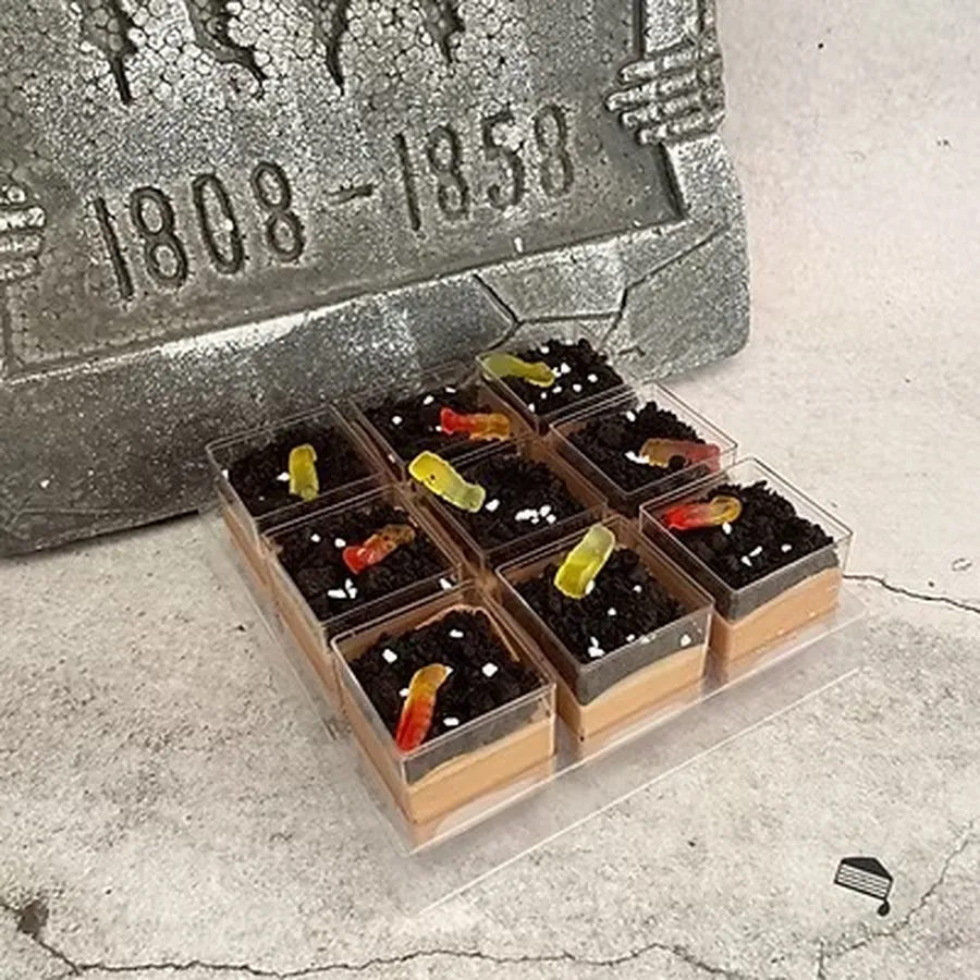 Spooky mini dessert cups layered with rich flavors and topped with gummy worms and creepy crawlies for a frightfully fun Halloween treat!