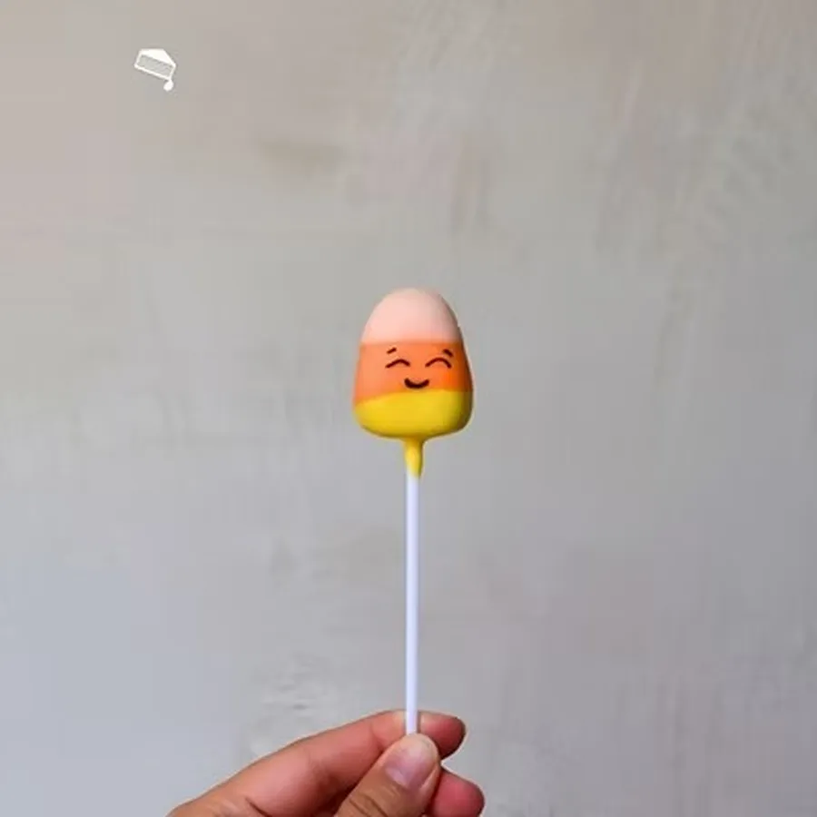 Fun and festive candy corn cakepops layered in cheerful yellow, and orange. A sweet bite of Halloween magic!