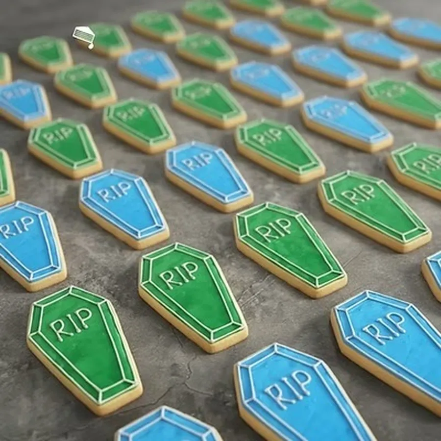A blue coffin-shaped cookie with the word “RIP” on top, simple yet perfectly spooky for Halloween! Adding a unique twist to your Halloween treat box!