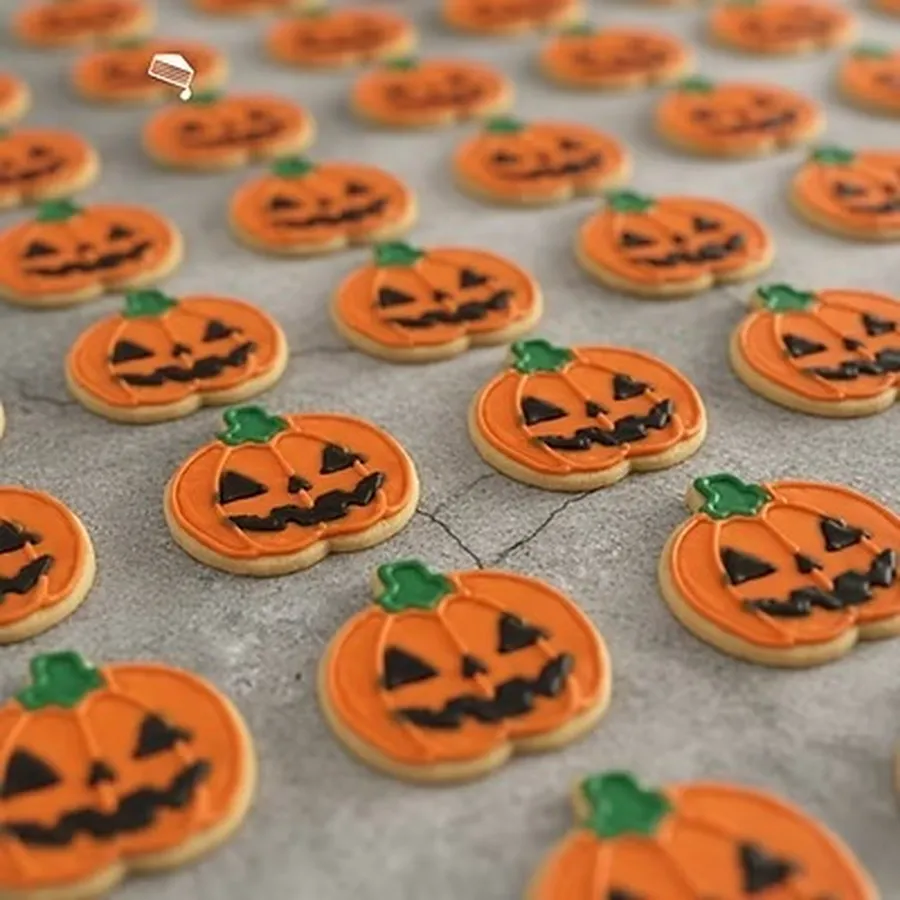 A festive pumpkin-shaped cookie with a spooky carved face, perfect for Halloween treats!