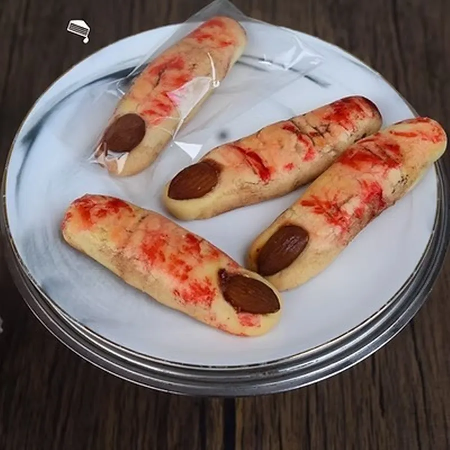 Creepy yet delicious cookies shaped like fingers, complete with almond “nails” and strawberry “blood” for that spooky touch.