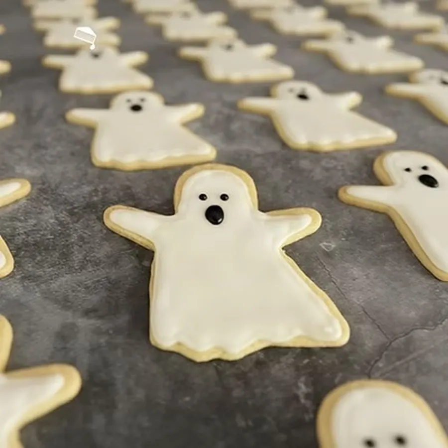 A cute and spooky cookie shaped like a friendly ghost, perfect for adding sweet chills to your Halloween treats!