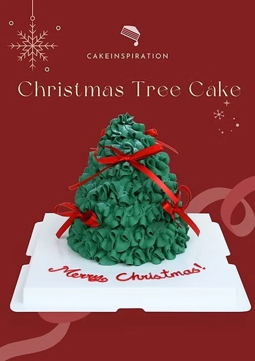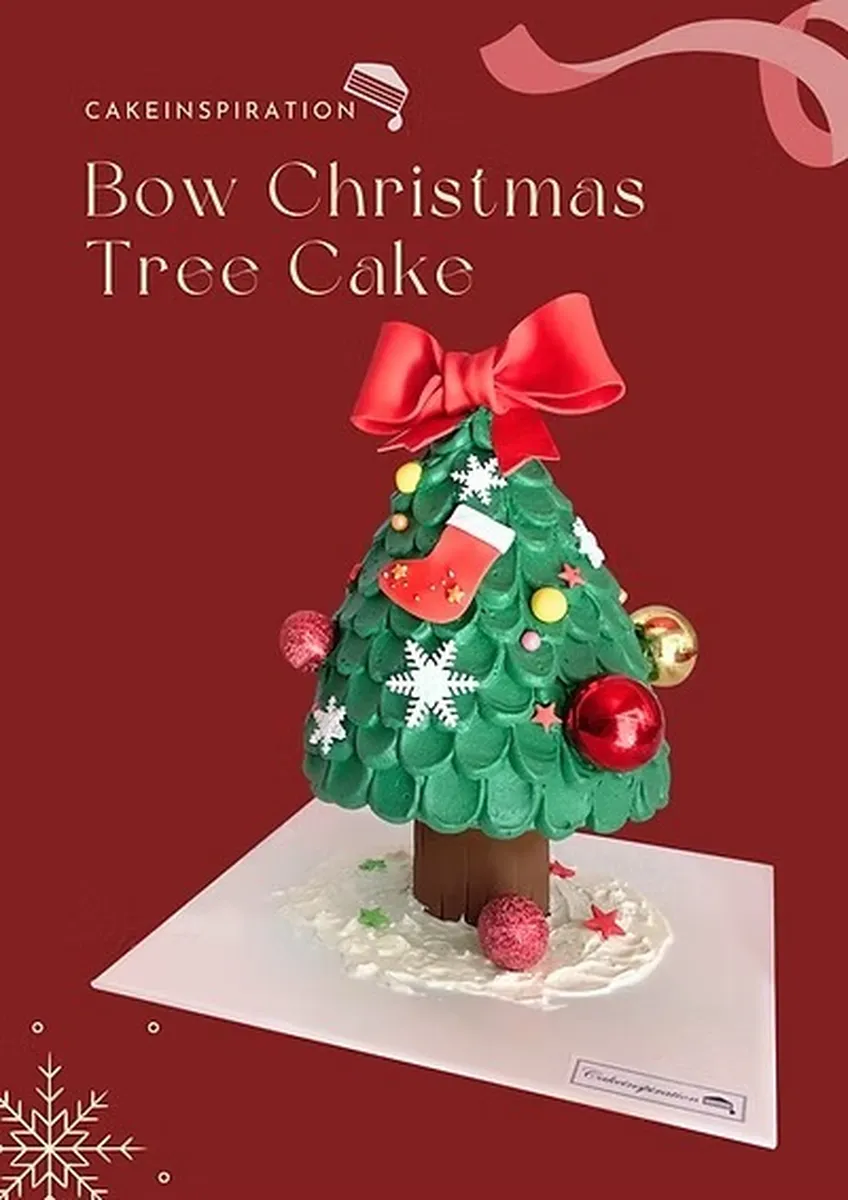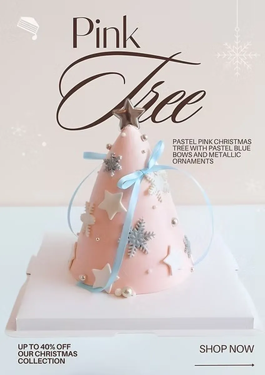Pink Christmas Tree Cake – A dreamy pastel pink Christmas tree cake adorned with blue bows, white accents, and metallic ornaments — a whimsical centerpiece that’s as pretty as it is festive.