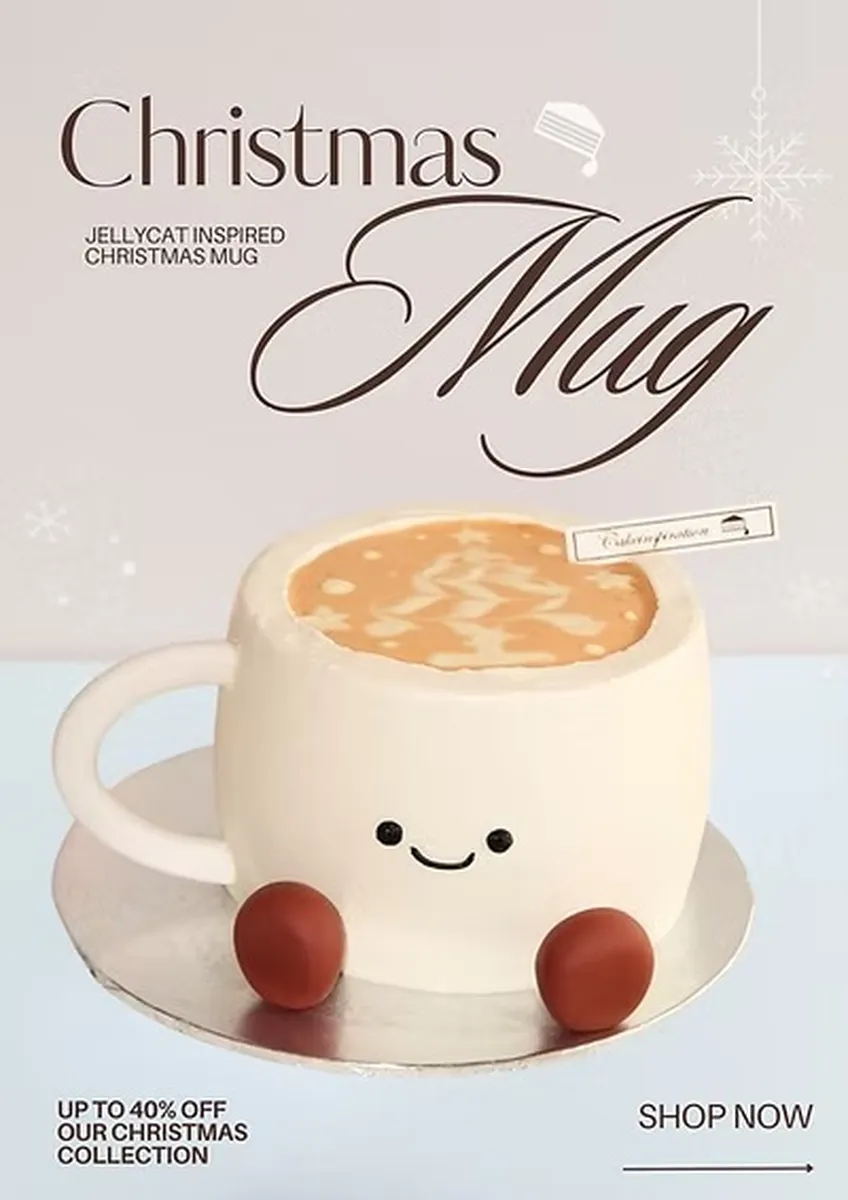 Christmas Latte Mug Cake – Inspired by cozy café vibes and jellycats, this adorable cake comes in a latte mug with a Christmas tree latte art design on top — a sweet, festive treat that’s as cute as it is delicious.