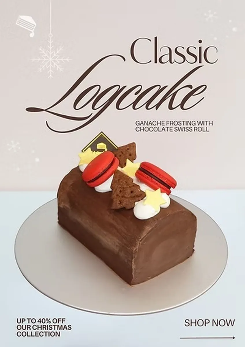 Classic Log Cake – A rich chocolate Swiss roll filled and coated with smooth chocolate ganache, finished in a festive log-style for the perfect bite of Christmas indulgence.