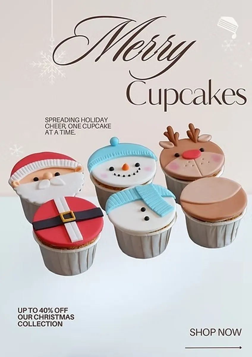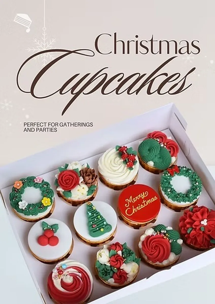 Christmas Cupcake Set – A classic set of festive cupcakes in cheerful red and green designs, topped with charming Christmas decorations for a joyful holiday treat.