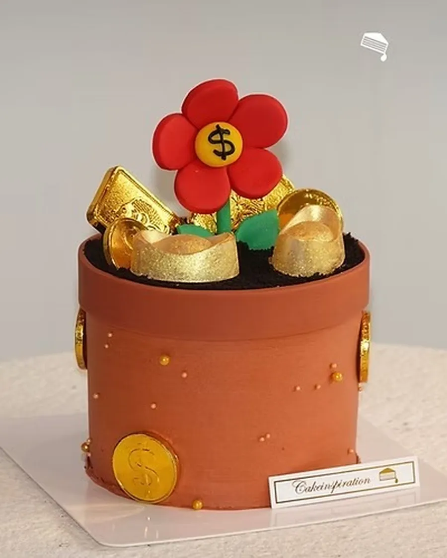 A playful and auspicious Money Pot Cake featuring gold coins, sycees, and a vibrant flower topper. A charming symbol of wealth, prosperity, and good fortune.