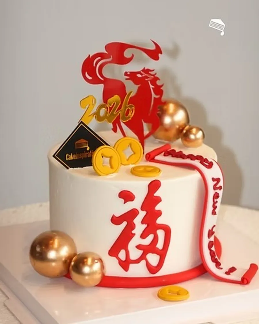 An elegant Chinese New Year 2026 cake featuring a red Horse zodiac topper, auspicious 福 symbol, and gold accents. Perfect for welcoming prosperity and good fortune.