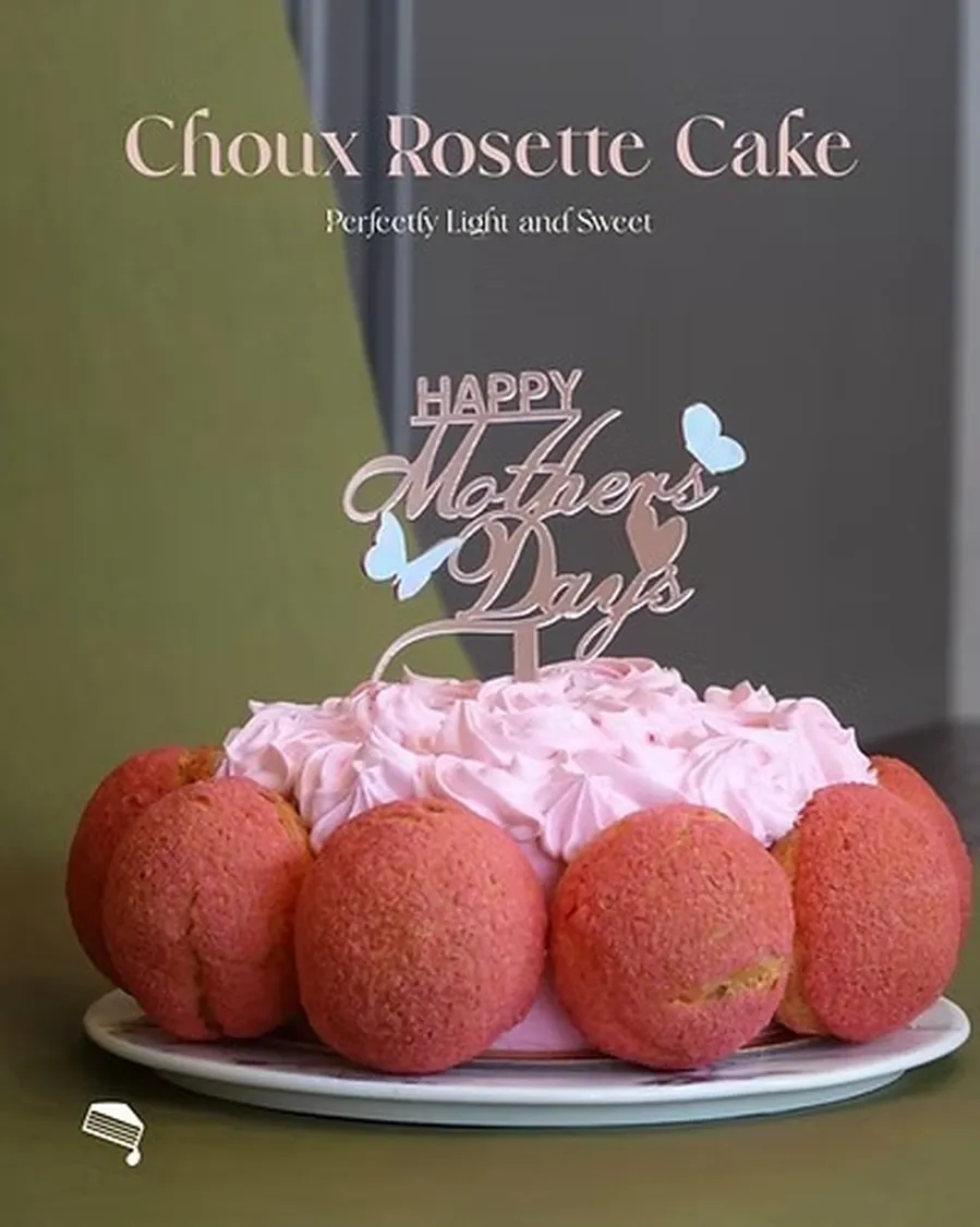 Treat Mom to this elegant Mother’s Day choux cake. Crispy choux au craquelin puffs form a golden border around hand-piped pink rosette cream, finished with a rose gold “Happy Mother’s Day” topper for a stylish and indulgent gift.