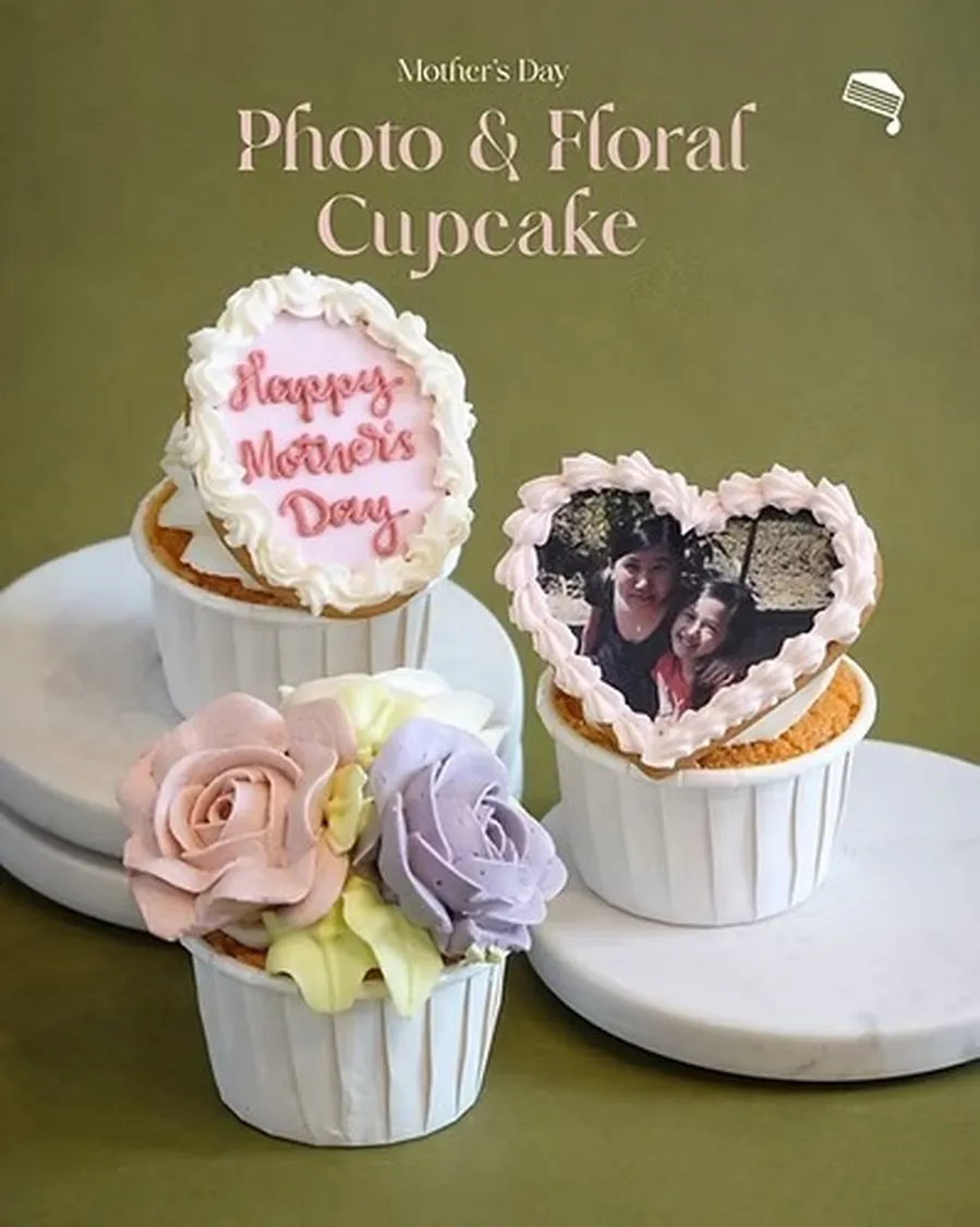 Celebrate Mom with this special set of 3 handcrafted cupcakes: one topped with a heart-shaped cookie featuring a personalized edible photo, one decorated with buttercream flowers, and one with a round cookie reading “Happy Mother’s Day.” A sweet and thoughtful gift for her special day.