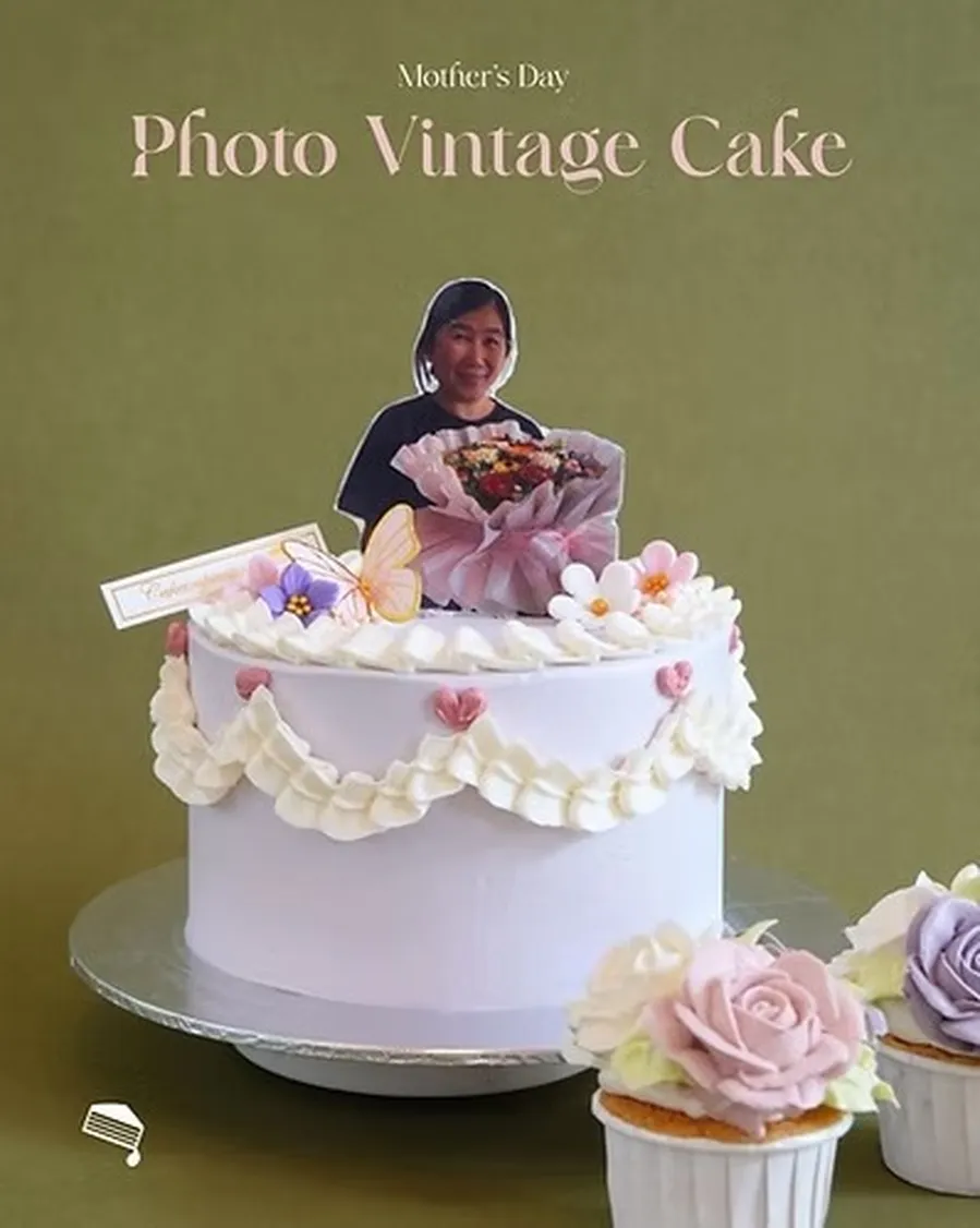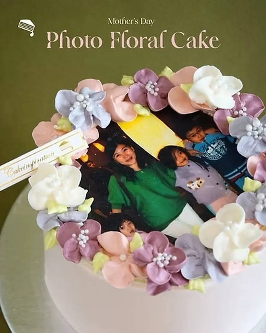 Celebrate Mom with this personalized Mother’s Day cake. Featuring your favorite family photo on an edible print, surrounded by hand-piped buttercream flowers in lilac, blush, and ivory, it’s a sweet and memorable centerpiece.