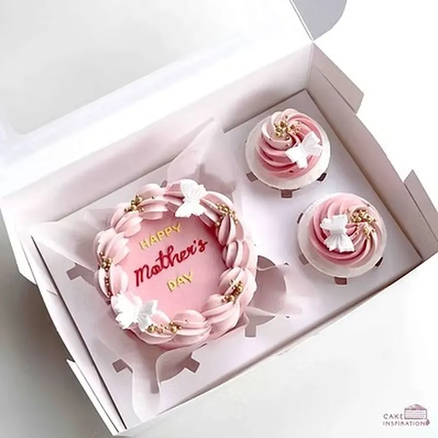 Celebrate Mom with a charming bento cake and cupcake set, delicately designed in soft pink hues and adorned with graceful butterfly decorations. The mini cake is a sweet centerpiece, paired with matching cupcakes topped with elegant swirls of frosting and dainty edible butterflies — a whimsical and heartfelt treat that’s as beautiful as she is.
